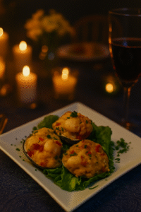 A warm blend of tender clam meat, red pepper, and yellow onion, delicately seasoned and served in-shell. This flavorful appetizer brings a coastal touch to your intimate evening, both comforting and refined. Available with select custom menus.