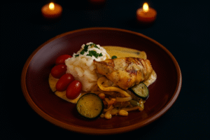 Tender chicken simmered in a rich lemon crème sauce, finished with delicate herbs and a hint of citrus. This comforting, elegant entrée is made to be savored slowly—perfect for sharing meaningful moments over a candlelit table. Included in select custom menus.